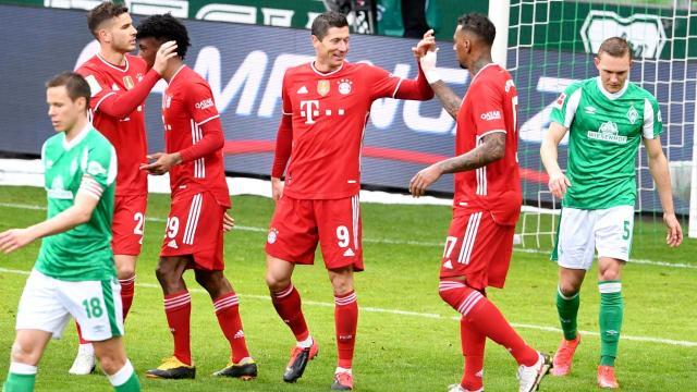 在第78分钟完成“门框帽子戏法”之后,莱万提前下场休息。这也是莱万首次在德甲完成这个另类的“帽子戏法”。本场赛前,莱万本赛季面对17个德甲对手,只有两个没取得进球:莱比锡和不来梅。而本场完成破门之后,莱万离单赛季通杀德甲列强,只剩莱比锡一个对手。拜仁与莱比锡RB将在第27轮交手,这场比赛的结果,也将直接影响到联赛冠军的归属。不来梅的进球出现在第86分钟,萨尔造越位时出现失误,替补出场的菲尔克鲁格破门得分,为不来梅挽回些许颜面。最近13次主场面对拜仁,不来梅全部输球,这也创造了德国职业联赛的一个纪录。